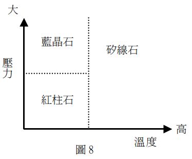 17. Al 2SiO5 有三種同分異構物,它們的生 成條件如圖 8 所示。如果海溝處的地 質環境為低溫高壓環境,則期望能在 海溝處找到成分為 Al 2SiO5 且真正代表低溫高壓的礦物為何? (A)紅柱石 (B)藍晶石 紅柱石 (C)矽線石 (D)藍晶石和紅柱石 高 (E)紅柱石和矽線石