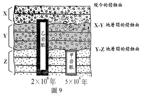 22. 在 X、Y、Z 地層中之甲、乙岩脈,其定 年資料如圖 9 所示,試問 Y 地層的地質 時代應屬於表二中的那一「世」? (A)更新世 (B)上新世 (C)中新世 (D)漸新世 (E)始新世