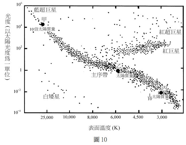 24. 赫羅圖(圖 10)的主序帶上,甲星質量為太陽的 10 倍,乙星的質量與太陽相同, 則甲星的壽命大約是乙星的幾倍? (A)104 (B)102 (C)1 (D)10- 1 (E)10- 3