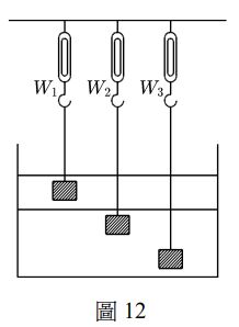 38. 有一容器,內裝互不相溶的兩種液體。今將質量及體積皆相同 的三個鋁塊,分別以細繩懸吊於彈簧秤下,使靜止於液體中, 如圖 12 所示。若「彈簧秤的讀數」分別為 W1、W2 和 W3, 則下列大小關係,何者正確?(細繩之重量及粗細不計) (A)W1= W2= W3 (B)W1 > W2 = W3 (C)W1> W2 > W3 (D)W1 < W2 = W3 (E)W1 < W2< W3