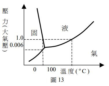 39. 圖 13 為純水在不同壓力與溫度時的狀態示意 圖(未按實際比例)。若將純水的溫度維持0℃,壓力自 10 大氣壓下降,直至 10- 3 大氣 壓。則在此過程中,純水的狀態改變情形, 下列何者正確? (A)固態→液態 (B)固態→氣態 (C)液態→氣態 (D)固態→液態→氣態 (E)液態→固態→氣態