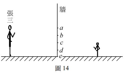 40. 張三與他的兒子分別站立於一面牆的兩邊,如 圖 14 所示。若要在牆上開一個窗子使兩人彼 此都能看到對方的全身,則所需的最小窗子的位置應為下列何者? (A)ae (B)ad (C)be (D)bd (E)cd