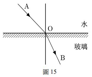41. 如圖 15 所示,一光線在水中沿 AO 入射至玻璃 後,沿 OB 折射。下列敘述何者正確? (A)若入射角增大,有可能產生全反射 (B)若光改自 BO 入射,則會沿 OA 折射 (C)光在水中的速率小於在玻璃中的速率 (D)光在水中的頻率小於在玻璃中的頻率 (E)光在水中的波長等於在玻璃中的波長