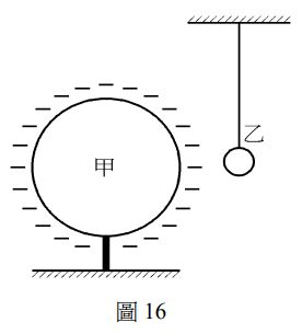 42. 一個輕而未帶電的金屬小球乙,用一絕緣線懸掛著, 如圖 16 所示。若將一帶電的金屬球甲靠近乙,則下列 敘述何者正確? (A)乙先被甲排斥,然後被甲吸引與甲接觸 (B)乙被甲吸引,然後一直保持與甲接觸 (C)乙先被甲吸引接觸甲,然後被甲排斥離開甲 (D)乙被甲排斥,不可能碰觸甲 (E)乙不受影響,保持不動