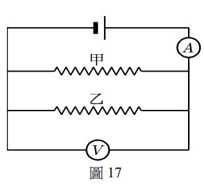 45. 圖 17 的電路,V、A 分別代表伏特計與安培計,如將電 路中的甲電阻拆掉,則伏特計與安培計的讀數有何變化? (A)V 與 A 的讀數均不變 (B)V 的讀數不變,A 的讀數增大 (C)V 的讀數不變,A 的讀數減小 (D)V 的讀數增大,A 的讀數不變 (E)V 的讀數減小,A 的讀數不變