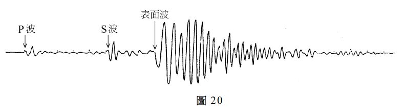 73. 某測站收到的地震波如圖 20 所示。下列有關此三種波的比較敘述,何者正確?(應選二項) (A)P 波的速度最慢 (B)P 波最先到達測站 (C)波屬橫波 (D)S 波屬縱波 (E)S 波的速度最快 (F)表面波的振幅最小 (G)表面波的速度最慢