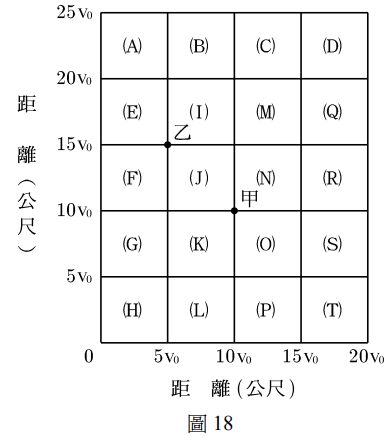 68. 一儲氣槽因不慎爆炸,小美位於圖 18 的甲地,先看到發出的火光,5 秒後才聽到爆炸聲,小明於乙地則是在看到火光後 10 秒才聽到爆炸聲。若聲速為 vo 公尺/秒, 則爆炸的儲氣槽可能位於圖 18 的那些方塊區?(應選二項)