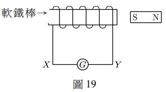 69. 漆包線所製成的螺線圈與磁鐵的位置如圖 19 所示,電路中 G 為電流計。下列的何 種情況螺線圈會有感應電流流過?電流的方向為何?(應選二項)(A)磁鐵快速靠近螺線圈時,電流由 Y 經 G 流向 X (B)磁鐵快速靠近螺線圈時,電流由 X 經 G 流向 Y 軟鐵棒→ 圖 19 (C)螺線圈快速靠近磁鐵時,電流由 Y 經 G 流向 X (D)螺線圈快速靠近磁鐵時,電流由 X 經 G 流向 Y (E)螺線圈與磁鐵一起以相同的速度向右移動時,電 流由 X 經 G 流向 Y (F)螺線圈與磁鐵一起以相同的速度向右移動時,電 流由 Y 經 G 流向 X70-77 為
