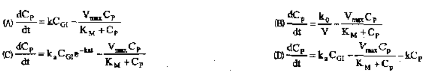 66 一藥物以一階次速率口服吸收至體內,而且該藥物在體內的排除遵循非線性藥動學,在此種情況下藥物血中濃度變化速率可以下列何項方程式表示之?(k是一階次排除速率常數,K0是輸注速率,Ka是一階次吸收速率常數,Vmax是最大排除速率,KM是Michaelis常數,CGI是藥物在胃腸道之濃度,V是擬似分佈體積)