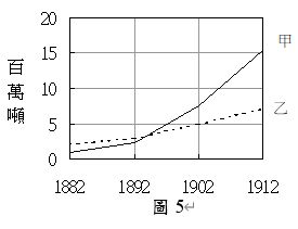 53. 十九世紀後期,工業革命的進程加速,各工業國的實力發生變化。右圖是某兩個工業國家粗鋼的產量圖。請問:圖中的兩條線分別代表哪個國家? (A)甲:德國;乙:英國 (B)甲:俄國;乙:日本 (C)甲:英國;乙:美國 (D)甲:法國;乙:德國