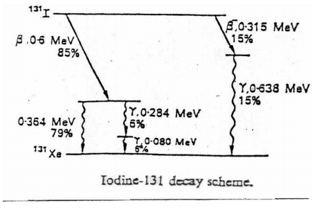 I 的蛻變圖如下。病人服用 2mCi131I 後,假設甲狀腺質量為 20g,