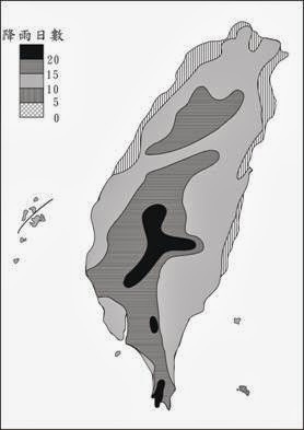 29. 圖一為臺灣本島七月份的降水日數分布圖,影響圖中七月雨日等值線分布的最主要因素為何?