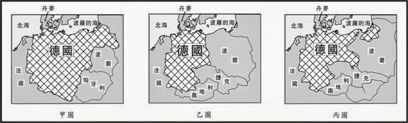 57. 圖七中,甲、乙、丙是德國歷史上三個不同時期的地圖,地圖中所列之國家均已翻譯成現在的名稱。這三份地圖所反映的時間先後順序為何?