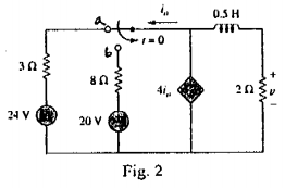 【已刪除】2, The switch in Fig. 2 has been in position a for a long time. At / = 0, it moves to position b. Find v(t) for t > 0. (25%)