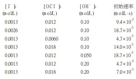 3. 如下式係用以評估氫氧根離子濃度對反應速率之影響I −(aq) +OCl-(aq) →IO- (aq) + Cl(aq)-+OCl-(aq)而試驗資料如下所示由以上數據試決定其反應速率式和其速率常數?