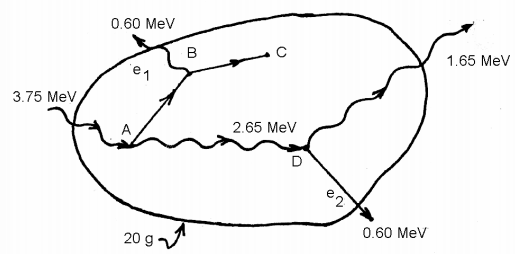 【已刪除】8. 3.75 MeV 的光子衝擊 20 克的靶,產生 Compton 電子 e1為 1.10 MeV,如下圖所示。此 Compton 電子誘發 0.60 MeV 的 Bremsstrahlung 在 B 點處並行進至 C 點處靜止下來。此 Bremsstrahlung 逸出靶,而無任何之相互作用於靶內。在 A 點 處散射的 2.65MeV 光子於 D 點處又產生 1.00 MeV 的 Compton 電 子 e
