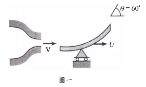 【已刪除】四、某機器的葉片之彎角為 60°,此葉片係以定速 U = 8 m/s 移動,同時承受一股來自固 定噴嘴的水柱作用,水柱的速度 V = 25 m/s,而噴嘴的出口橫剖面積為 0.002 m