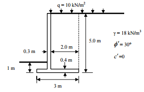 【已刪除】三、圖示一高 5 m 之懸臂式擋土牆,牆頂之載重 q = 10 kN/m