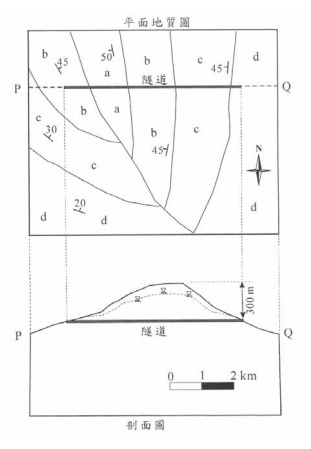 【已刪除】五、如下圖所示,有一東西向隧道將沿 PQ 線興建,須進行工程地質評估。圖中:a<b<c<d 為沉積岩地層,沉積年代 a