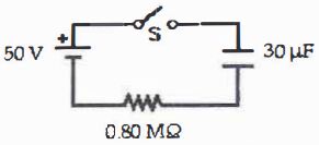 8.有一線路如圖所示,開關S打開,電容未充電。在時間t=0,開關S關起來(導通),請問一分鐘後電容器上電荷大約是多少μC?(50V電源、80MΩ電阻、30μF電容)