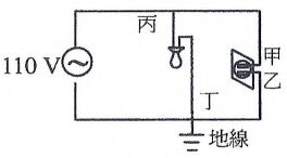 23.下圖為家用110伏特交流電的線路圖,甲、乙為插座之接線,丙、丁為電燈之接線,其中乙和丁均與電壓為零之地線相接。下列之敘述何者正確?