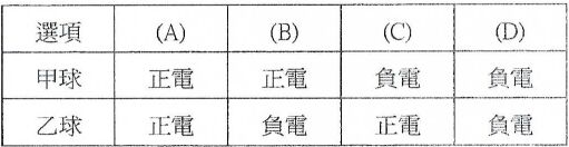 25.保利龍球很容易因摩擦起電而帶靜電。如下圖所示,為四個以絕緣細線懸吊的保利龍球,其相互間因靜電作用而呈現的排列情形。如果丁球帶正電,則甲球及乙球所帶的電性可能為下列哪些選項?
