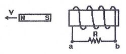 (A) 螺線管會產生吸引力 (B) 螺線管會產生排斥力 (C) 電流由a流向b (D) 電流由b流向a (E) 螺線管上沒反應