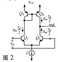 【已刪除】二、圖 2 所示為一具有主動負載(active load)的差動放大器(differential amplifier), 若偏壓電流 I = 0.2 mA,四個電晶體的β = 200,且 V