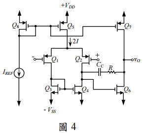 【已刪除】四、圖 4 所示為一具有兩級 CMOS 運算放大器結構,若八個電晶體的通道寬度與長度之 比值 w/L 如下表所示: