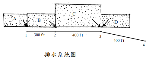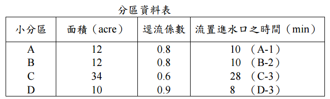 【已刪除】⑴某一小集水區,細分為 4 個小區(A、B、C、D),其排水系統如下圖所示。每 一分區之資料如下表所示。假設下水道內之流速均為 4.5 ft/sec,5 年頻率之降雨 強度公式為: