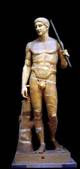 13.圖B所呈現的雕像是兩千五百年前的雕刻家Polyclitus採用哪種人體完美比例製作的?(a)身高等於頭部的七倍﹙b)身高等於頭部的七倍半﹙c)身高等於頭部的八倍﹙d)身高等於頭部的八倍半。