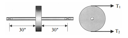【已刪除】一、有一兩端用軸承支撐 5 呎長的軸,軸中央用鍵鎖緊一 200 lb 重的滑輪,如圖所示。 該滑輪在 150 rpm 轉速下接收 20 hp 的動力。驅動皮帶水平且皮帶上之張力的總和 為 1,500 lb。假設作用之彎曲力矩(bending moment)與扭矩(torque)產生的陡震 與疲勞因素(shock and fatigue factor)不計。求所需軸之最小直徑。(假設允許應 力 σ (allowable)= 6,000 psi) (請注意:本題採英制單位)(20 分)