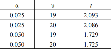 【已刪除】五、某距離之檢定值為 300.006 m。現以標準差為±0.002 m 之精度重複觀測該距離 20 次 ,得平均值為 300.010 m。請以 0.05 之顯著水準判定該距離平均值是否與檢定值有 顯著之差異。(t 分布之值如表列,其中 α 為顯著水準,υ 為自由度)。(20 分)