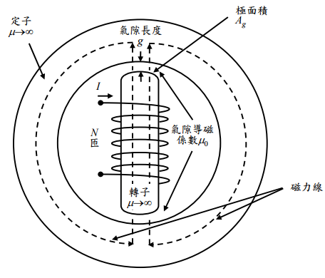 【已刪除】一、下圖所示為一基本同步電機之磁路。若假設轉子與定子鐵心之導磁係數為無限大 (µ→∞),試求氣隙之磁通量 φ(韋伯)及磁通密度 B