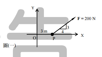 14. 如圖(一)所示,若 F = 200 N 且 P 點到 O 點的距離為 3 m,則 F 對 O 點之力矩的大小為 多少 N-m? (A) 300 (B) 360 (C) 480 (D) 600