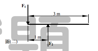 15. 如圖(二)所示,一工人以雙手握住一 3 m 長的均勻木棍,使木棍保持在水平位置。若木棍 的重量為 40 N,且工人雙手的施力 F