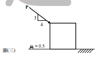16. 如圖(三)所示,一正方形木箱靜置於水平之地面上,若木箱的重量為 400 N,µs = 0.5, 且作用力 P 緩慢地增大,則使木箱即將開始滑動所需的最小作用力 P 的大小為多少 N? (A) 1,000 (B) 400 (C) 250 (D) 200