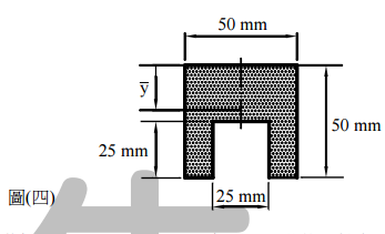 17. 如圖(四)所示,一具有正方形缺口的正方形板之外部尺寸為 50 mm × 50 mm,其缺口尺寸為 25 mm × 25 mm。若此板具有均勻之厚度及均勻之密度,則此板的重心位置y的值為多少 mm? (A) 25.00 (B) 23.63 (C) 21.67 (D) 20.83
