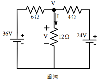 【已刪除】三、利用重疊定理,求出圖⑷中流過 12Ω 電阻的電流 I(10 分)和電壓 V。(10 分)