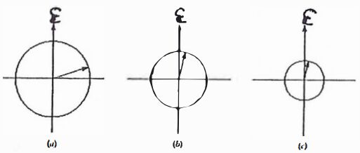 16. The phasor diagrams on the right represent three oscillating emfs having different amplitudes and frequencies at a certain instant of time t = 0. As t increases, each phasor rotates counterclockwise and completely determines a sinusoidal oscillation. At the instant of time shown, the magnitude of ε associated with each phasor given in ascending order by diagrams is