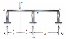 【已刪除】五、樑 ABC 放置於三根彈簧常數相同之彈簧上,如圖所示。 若樑之長度 L=4 m,其彎曲剛度(flexural rigidity)為 EI =10×10