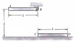 【已刪除】三、兩桿件 AB 及 CD,其質量均為 m,若 AB 桿由圖示之位置自 由釋放,當其擺動至垂直位置時與 CD 桿相撞。假設兩桿間 互撞之復原係數(coefficient of restitution)為 e = 0.4,試求 在撞擊後 CD 桿之速度及 AB 桿之角速度分別為多少?(20 分)