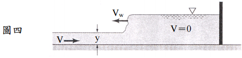 【已刪除】四、有一矩形渠道以一流速 V=10 m/s,水深 y=1 m 流向下游如圖四所示。下游水閘門 突然關閉,形成一湧波(moving bore)以 V