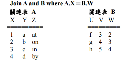 【已刪除】三、關連式的表格處理中,有三個主要的運算。除了 join 的運算之外,另外兩個為何? 以下面兩個關連表為例,執行如下之 join 運算,其結果為何?(15 分)
