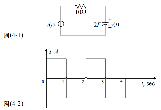 【已刪除】四、如圖(4-1)電路圖所示,有一個電阻 10Ω、一個電容 2F 及一個獨立電流源i(t),其波 形如圖(4-2)所示。假設時間為 t<0 時,電容電壓值v(t)為零,求出電容電壓值v(t) 在時間為t ≥ 0時的波形並以圖示之。(20 分)
