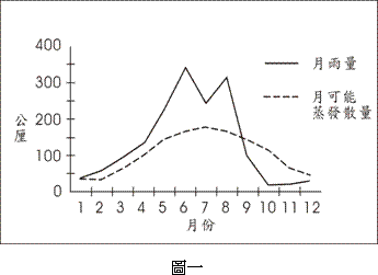 28.圖一為臺中地區1961年至1990年平均的逐月水平衡圖。圖中的可能蒸發散量是指一般旱作或草地,滿足土壤蒸發和植株正常生長所需的蒸發散水量。假設土壤因雨水下滲所儲存的土壤水量最高為100mm,則超出的雨水將會成為逕流流出。