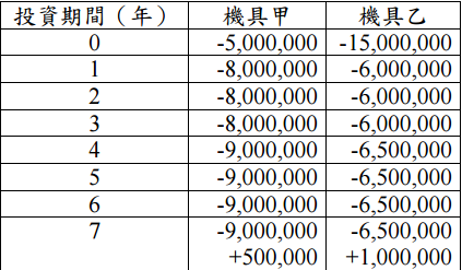 【已刪除】六、以下為兩大型營建機具的購置成本、每年的操作維護成本,以及汰換時的殘值 (Salvage value)等,所構成的現金流量: