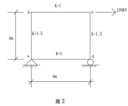 【已刪除】二、分析圖 2 剛構架,並繪製彎矩圖(10 分)、剪力圖(5 分)、軸力圖(5 分)及變 形示意圖(Elastic curve)(5 分)。