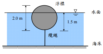 【已刪除】一、一個圓球形浮標(直徑 2.0 m,比重 0.6)以纜繩固定於海床,浮標沈於水中的深度 為 1.5 m。水的密度為 1000 kg/m