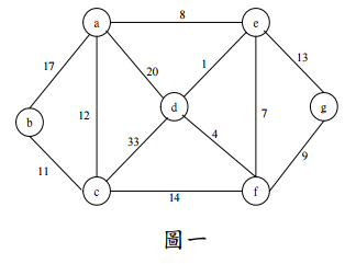 ⑴以節點 a 為起點依廣度優先走訪(Breadth First Search)方法列出走訪的節點(node) 順序,當有多重選擇時再以邊(edge)之權值小者優先。(5 分)
